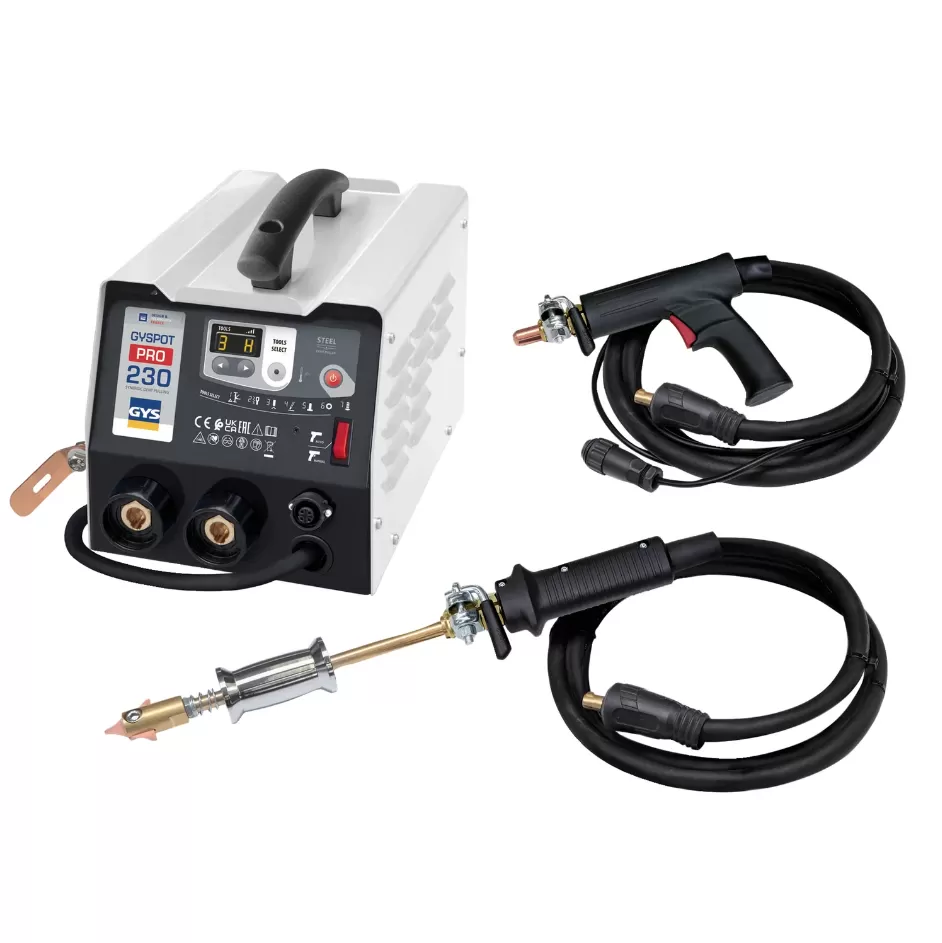- Máy hàn rút tôn GYSPOT PRO 230 được trang bị hai súng hàn nó có thể hàn và giật hai mối hàn cùng một vết lõm, nhằm đảm bảo vết lồi lõm được khắc phục tối đa. Với máy hàn rút tôn này bạn có thể di chuyển nó mọi nơi mà bạn muốn vì được sử dụng điện nguồn 220V.Hướng dẫn sử dụng máy hàn rút tôn GYS 230.